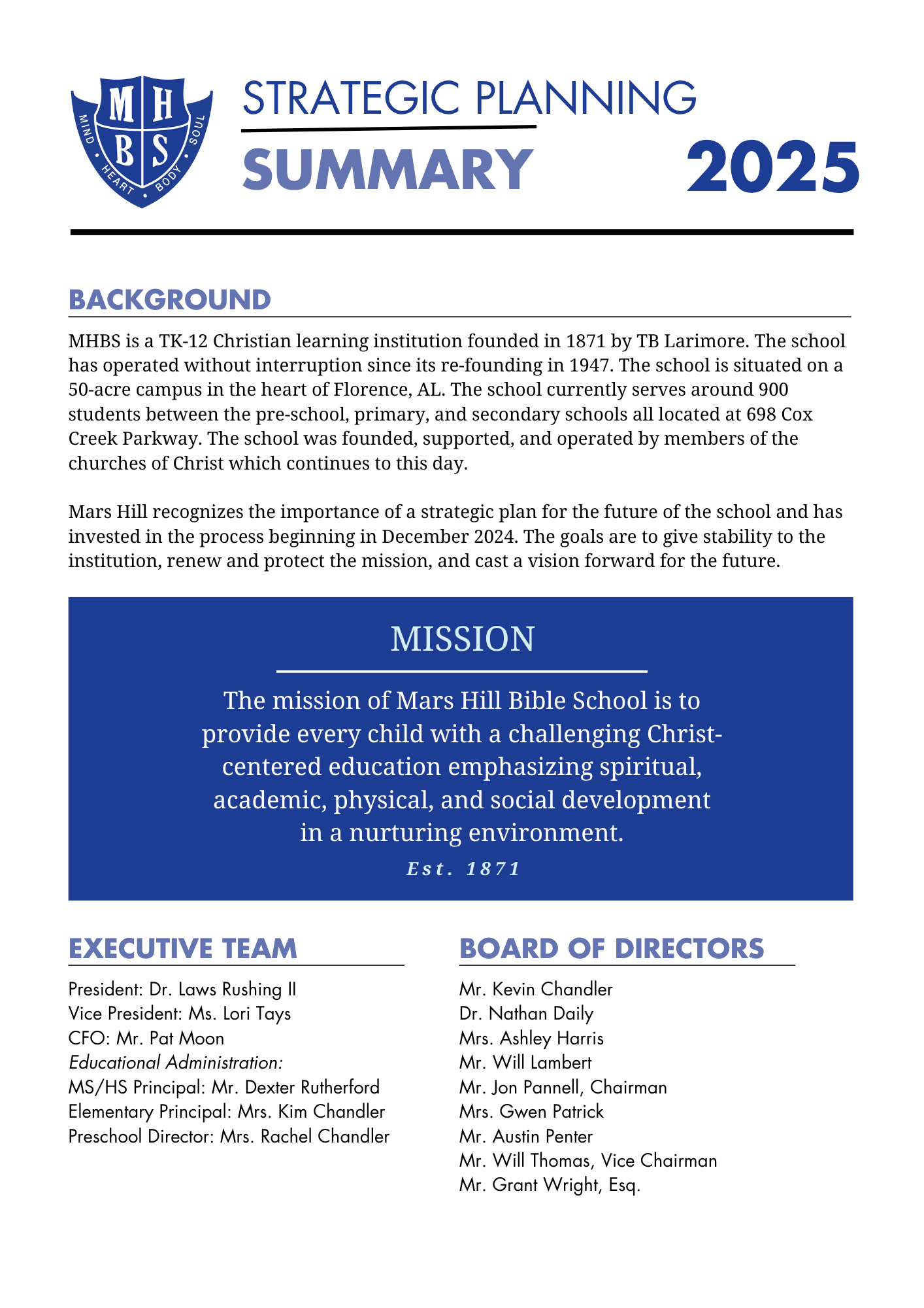 A strategic plan is a roadmap that helps an institution move forward with clarity, purpose, and unity. For Mars Hill Bible School, this plan reflects who we are—our mission, our values, and our identity as a Christ-centered school. It identifies the opportunities and challenges shaping Christian education today and outlines the intentional steps we will take to ensure that every decision, investment, and initiative aligns with our mission to nurture the spiritual, academic, physical, and social development of every student. This plan represents our shared commitment to stewarding God’s gifts wisely and preparing for a strong future grounded in faith and excellence.