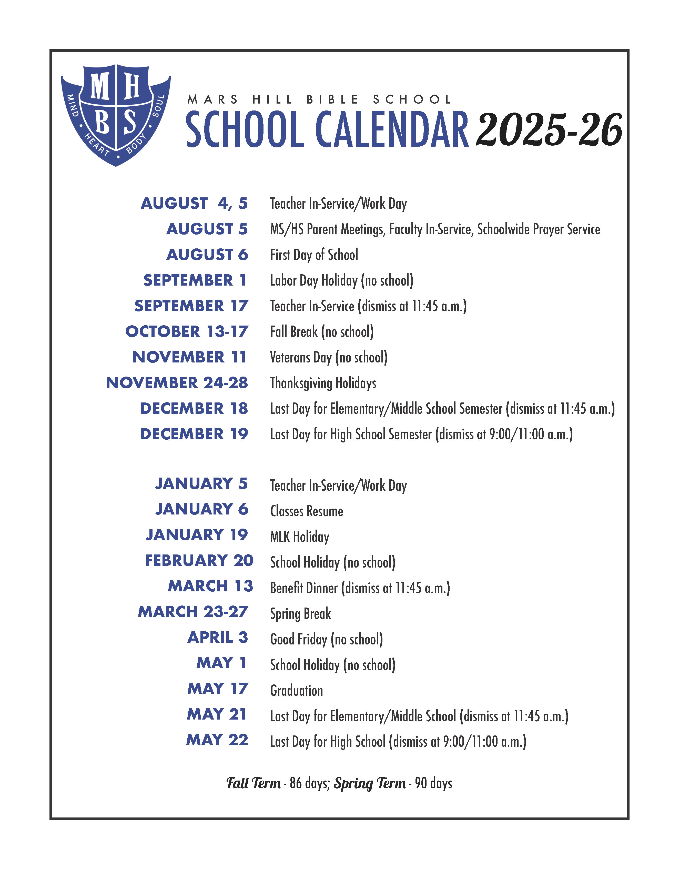About About Core Beliefs and Values Strategic Plan History Faculty/Staff Directory Leadership Employment Requests for Quotes Admissions Admissions Apply Tuition and Finances Financial Aid Testimonials Open House Wait List Interest Form Spiritual Spiritual Biblical Worldview Annual Theme Blog Academics Academics Preschool Elementary Middle/High School Arts Arts Band Chorus Show Choir Theater Robotics Debate Clubs and Organizations Athletics Athletics Life at MHBS Life at MHBS School Calendar FACTS Family Portal Login Lunch Menu News and Announcements Social Media Giving Alumni Faculty Alumni Support Families